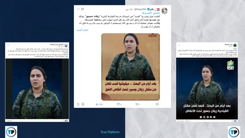 📍تداول نشطاء إلى جانب صفحات وحسابات عبر منصّتي فيسبوك وإكس، مؤخراً، منشورات تزعم أن قوات سوريا الديمقراطية (قسد) أعلنت مقتل القيادية في صفوفها "زيلان جسور" داخل نفق انهار في محافظة الحسكة، وذلك بعد أن كانت قد هدّدت بالوصول إلى دمشق خلال ساعات.