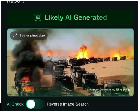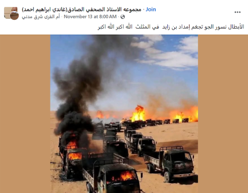تداولت العديد من الحسابات على منصة «فيسبوك» صورة تُظهر عربات محترقة في منطقة صحراوية، مدعيةً أنّها توثق تدمير سلاح الجو السودانيّ شاحنات تحمل إمدادات قادمة لقوات الدعم السريع في منطقة المثلث الحدودية بين السودان ومصر وليبيا. في وقت تداولت فيه حسابات مصرية الصورةَ نفسها، على أنها توثق مصير كل سلاح أو دعم يأتي إلى «الدعم السريع»، في إشارة إلى تدخّل سلاح الجو المصريّ لحفظ أمنها القوميّ.