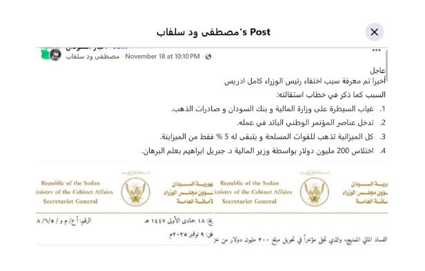 تداولت العديد من الصفحات على منصة «فيسبوك» صورة خطاب تظهر فيه ترويسة وزارة شؤون مجلس الوزراء في السودان، على أنه خطاب استقالة رئيس الوزراء كامل ادريس من منصبه، لأسباب منها –بحسب الخطاب– عدم سيطرته على المؤسسات المالية والإدارية في الدولة، وتدخّل عناصر النظام السابق في القرارات الحكومية، إلى جانب عدم توفر ميزانية للتنمية والتركيز على الصرف العسكري –بالإضافة إلى الفساد المالي الممنهج– طبقًا لنص الخطاب المتداول.