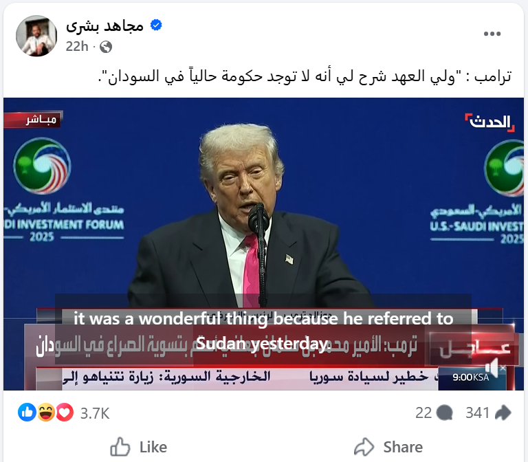 تداولت العديد من الحسابات على «فيسبوك» مقطع فيديو للرئيس الأمريكي دونالد ترامب من قناة الحدث السوداني، يعلن فيه عن تدخّله المباشر لإنهاء الحرب في السودان، بطلبٍ من وليّ العهد السعودي الأمير محمد بن سلمان، مدعيةً أنّ ترامب صرّح بأنّ وليّ العهد السعودي شرح له أنه «لا توجد حكومة حاليًا في السودان».
