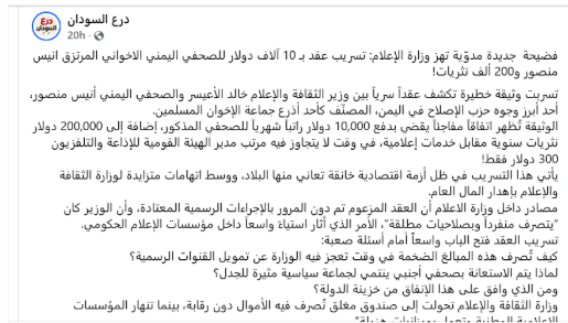 «فضيحة جديدة مدوّية تهز وزارة الإعلام: تسريب عقد بـ 10 آلاف دولار للصحفي اليمني الاخواني المرتزق انيس منصور و200 ألف نثريات!