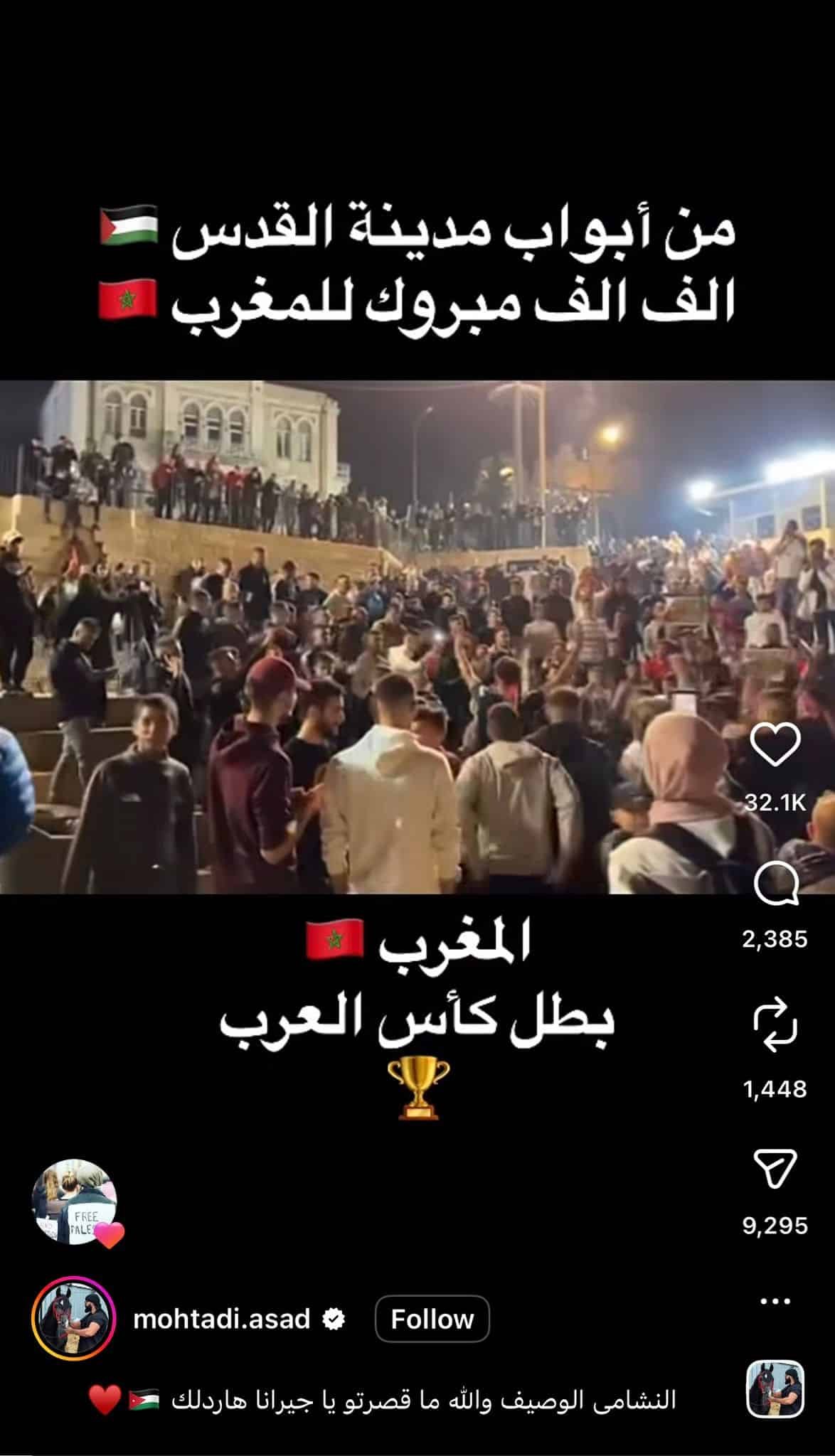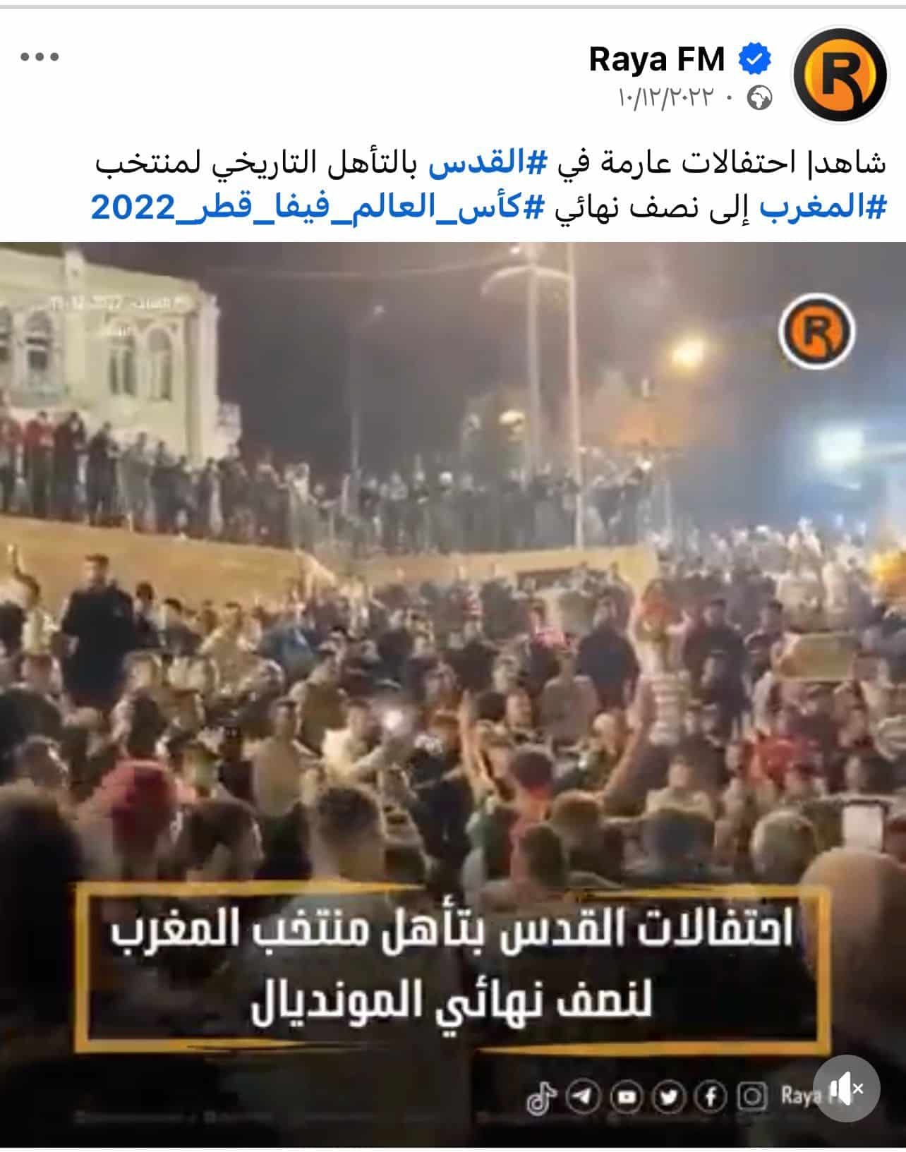 ونُشر سابقاً بتاريخ 10 ديسمبر/كانون الأول 2022 عبر عدة مواقع إخبارية، من بينها شبكة راية الإعلامية وMiddle East Eye، ويعود لمشاهد توثّق احتفالات المقدسيين بفوز المنتخب المغربي على نظيره البرتغالي في كأس العالم 2022.