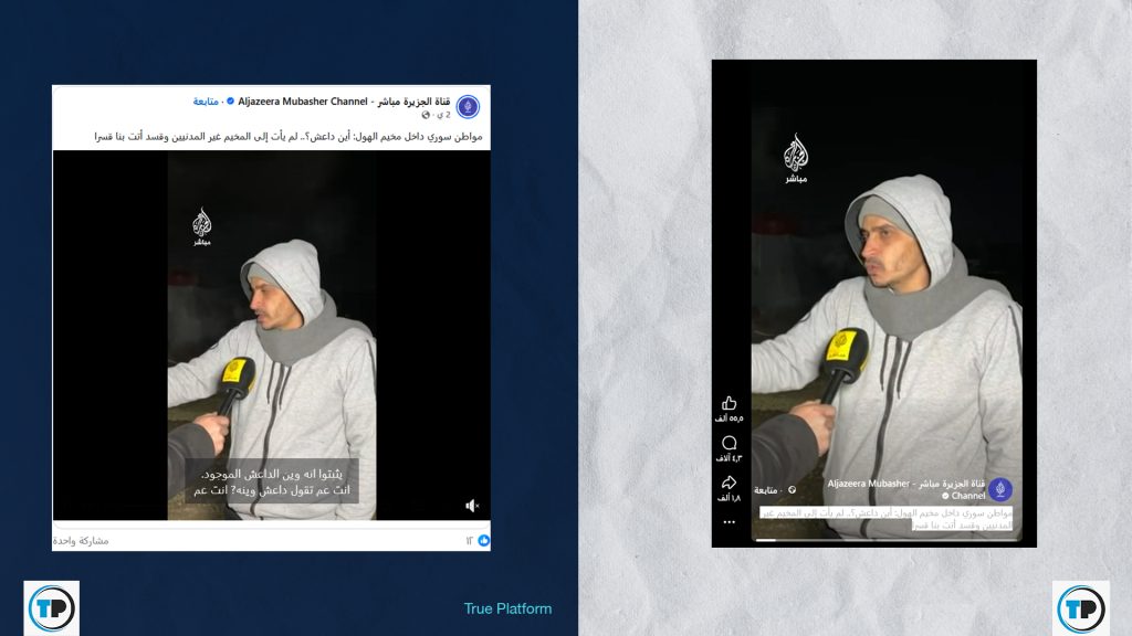 📍بثت قناة "الجزيرة مباشر" مؤخراً، لقاءً من مخيم الهول للاجئين، ظهر فيه شاب يدعي أنه "مدني" احتجزته قوات سوريا الديمقراطية قسراً منذ سنوات، نافياً وجود أي منتسبين لتنظيم داعش في المخيم، الواقع جنوبي محافظة الحسكة.