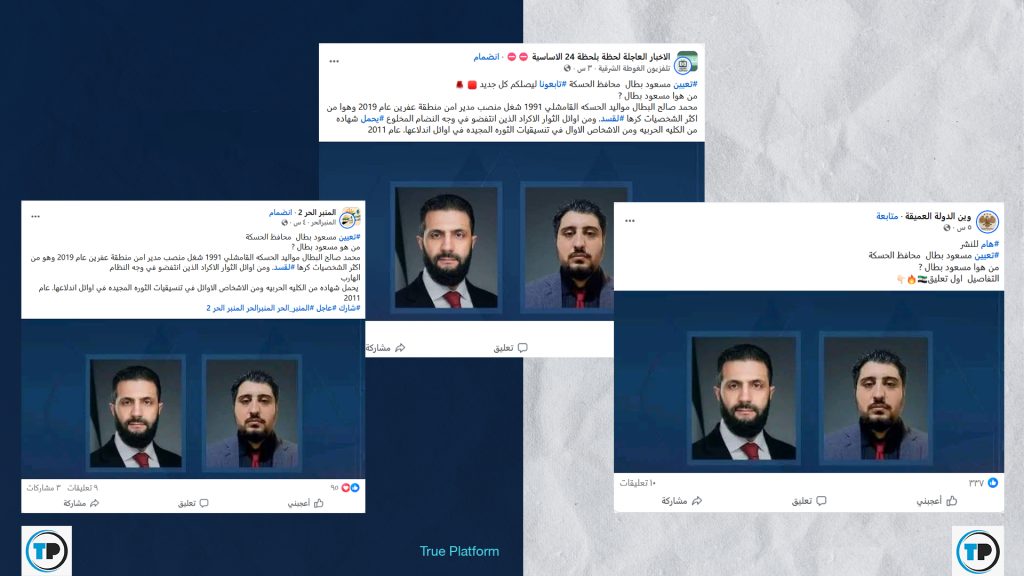 📍تحرى فريق شبكة تدقيق المعلومات - True Platform، حقيقة #الادعاء، وتبين في الخلاصة: ✅الادعاء أن الحكومة السورية عينت #مسعود_بطال محافظاً للحسكة، غير صحيح. ✅قدمت قسد مرشحها لتولي منصب #محافظ_الحسكة بموجب اتفاقها مع #الحكومة_السورية، لكن الأخيرة لم تعلن موافقتها من عدمها حتى الآن. ✅تبين أن الادعاء بجميع جوانبه لا أساس له من الصحة، لذا صنف ضمن محتوى " #مفبرك" وفق منهجية شبكة تدقيق المعلومات - True Platform.