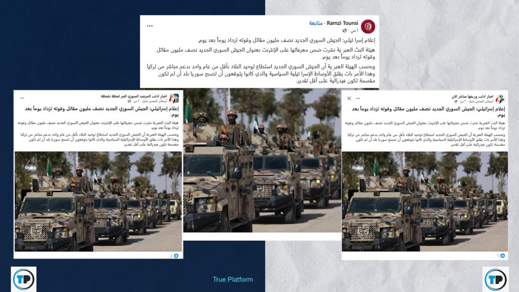 📍تداولت صفحات وحسابات على منصات التواصل الاجتماعي، مؤخراً، ادعاءً يزعم أن هيئة البث الإسرائيلية (مكان) نشرت تقريراً عبر معرفاتها الرسمية بعنوان: "الجيش السوري الجديد نصف مليون مقاتل وقوته تزداد يوماً بعد يوم".