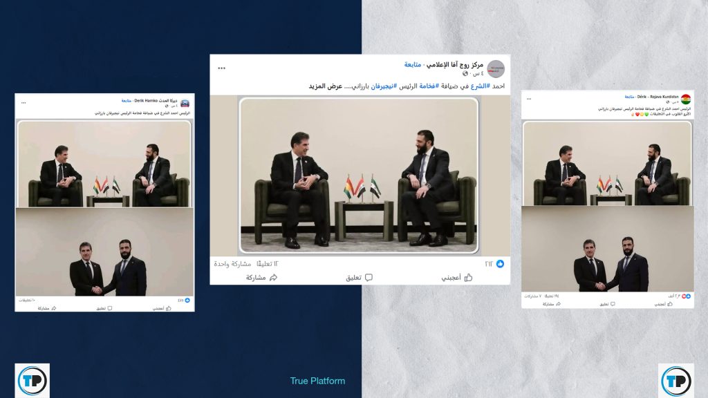 📍تداولت صفحات وحسابات عبر منصة فيسبوك، مؤخراً، صورتين مع ادعاءٍ بأنهما توثقان زيارة حديثة أجراها الرئيس السوري، #أحمد_الشرع إلى #إقليم_كردستان.