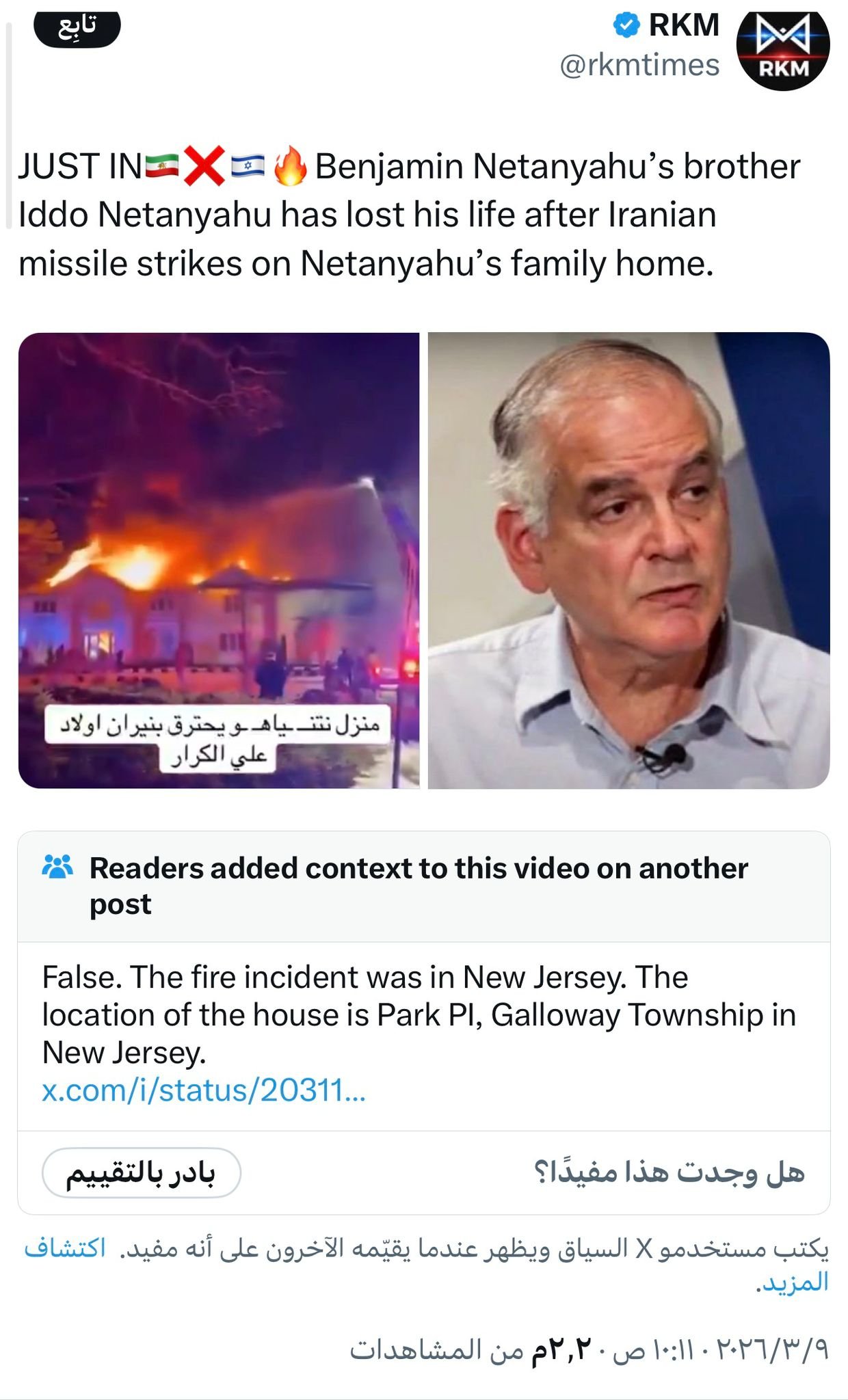| أثبت تدقيق مرصد "تحقق" زيف الخبر المتداول حول مقتل عيدو نتنياهو شقيق؛ فالمقطع يعود تاريخ نشره الأصلي إلى فبراير/شباط عبر حساب مصوِّر بجمعية رجال الإطفاء في مقاطعة أتلانتيك الأمريكية، ولا صلة له بأي عمليات عسكرية حالية أو بشقيق رئيس الوزراء الإسرائيلي. |