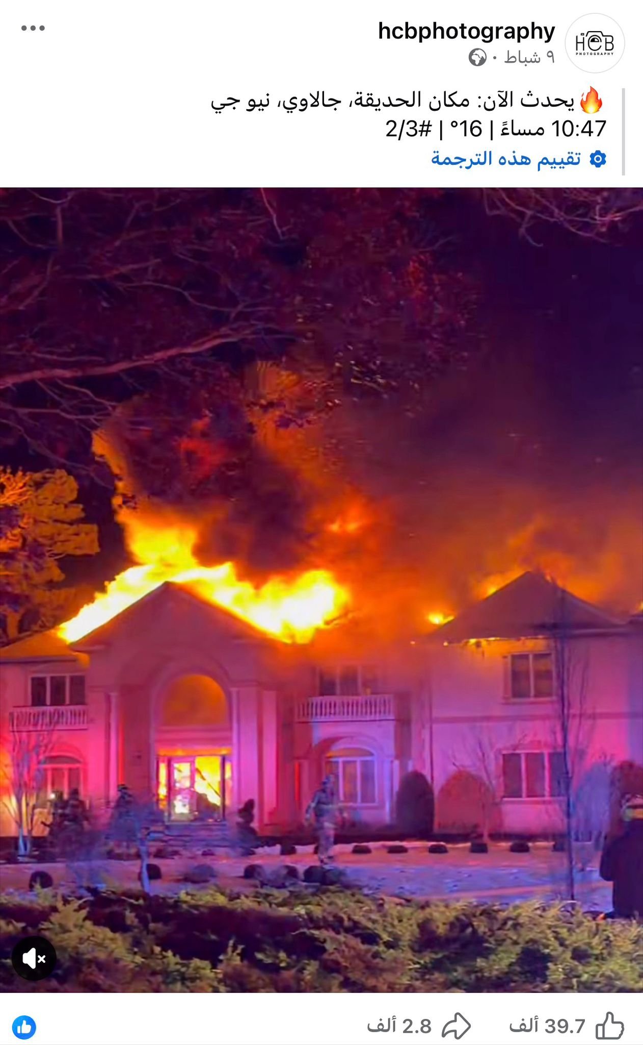 "hcb photography" على منصة فيسبوك بتاريخ 9 فبراير/ شباط، تحت تعليق يشير إلى وقوع الحادثة في منطقة "جالاوي" بنيوجيرسي. وقد نشر الحساب المذكور مقطعين من زاويتين مختلفتين في اليوم ذاته، يظهران المبنى وهو تلتهمه النيران، بينما تحاول طواقم الإطفاء السيطرة عليه. وبمراجعة هوية الحساب، تبين أنه يعود لمصور يعمل في "جمعية رجال الإطفاء بمقاطعة أتلانتيك".