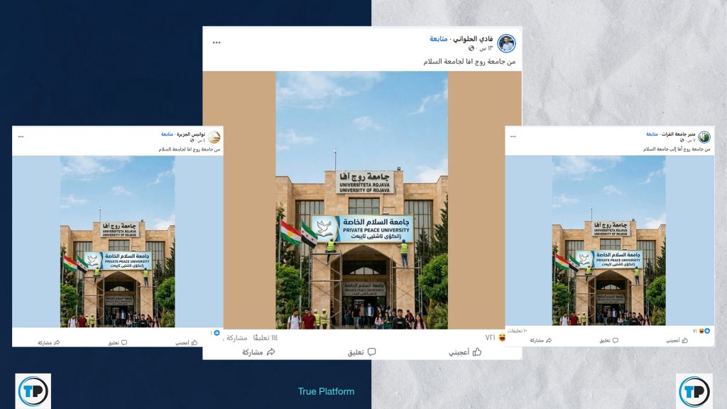 📍تداول نشطاء إلى جانب حسابات عبر منصة فيسبوك، مؤخراً، صورة مع ادعاء أن جامعة روجآفا التي يقع مقرها بمدينة القامشلي ستتحول إلى جامعة خاصة باسم جامعة السلام.