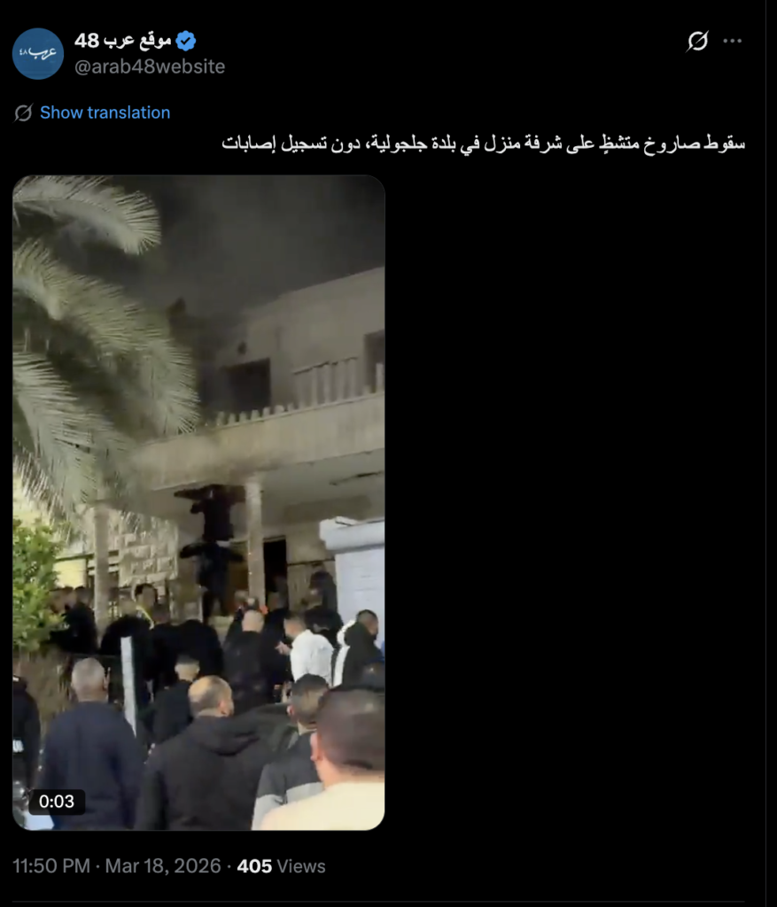 كما ونشر موقع عرب 48 مقطع الفيديو على حسابه الرسمي على منصة x، مرفقاً بالنص التالي: "سقوط صاروخ متشظٍ على شرفة منزل في بلدة جلجولية، دون تسجيل إصابات".