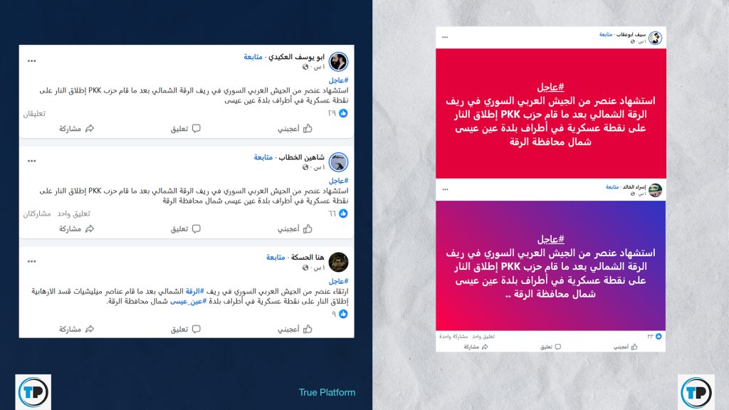 📍تداولت صفحات وحسابات عبر منصة (فيسبوك) منشوراتٍ تزعم مقتل عنصر من #الجيش_السوري جراء إطلاق عناصر من #قوات_سوريا_الديمقراطية (قسد) النار على نقطة عسكرية، على أطراف بلدة عين عيسى شمال الرقة.