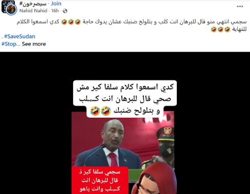 «سجمي انتهي منو قال للبرهان انت كلب و بتلولح ضنبك عشان يدوك حاجة كدي اسمعوا الكلام للنهاية ».