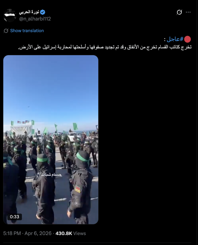 نشرت حسابات على مواقع التواصل الاجتماعي مقطع فيديو يظهر أعدادًا كبيرة من عناصر كتائب القسام خلال عرض عسكري بالقرب من البحر، مع الادعاء أن الفيديو حديث ويوثق عرضًا عسكريًا لكتائب القسام في قطاع غزة. وأُرفق الفيديو بالوصف التالي: "تخرج كتائب القسام من الأنفاق وقد جددت صفوفها وأسلحتها لمحاربة إسرائيل على الأرض".