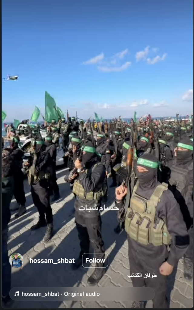 كما نشرت وكالة قدس على منصة X مقطع الفيديو ذاته مرفقًا بالوصف التالي: "أعداد كبيرة من عناصر كتائب القسام تنظم عرضًا عسكريًا خلال تسليم أسير إسرائيلي في ميناء غزة اليوم".