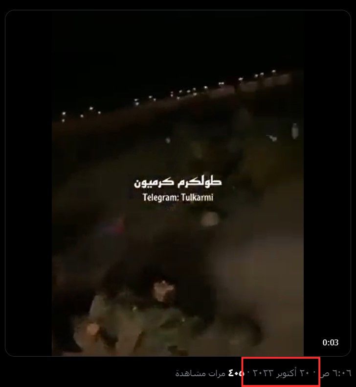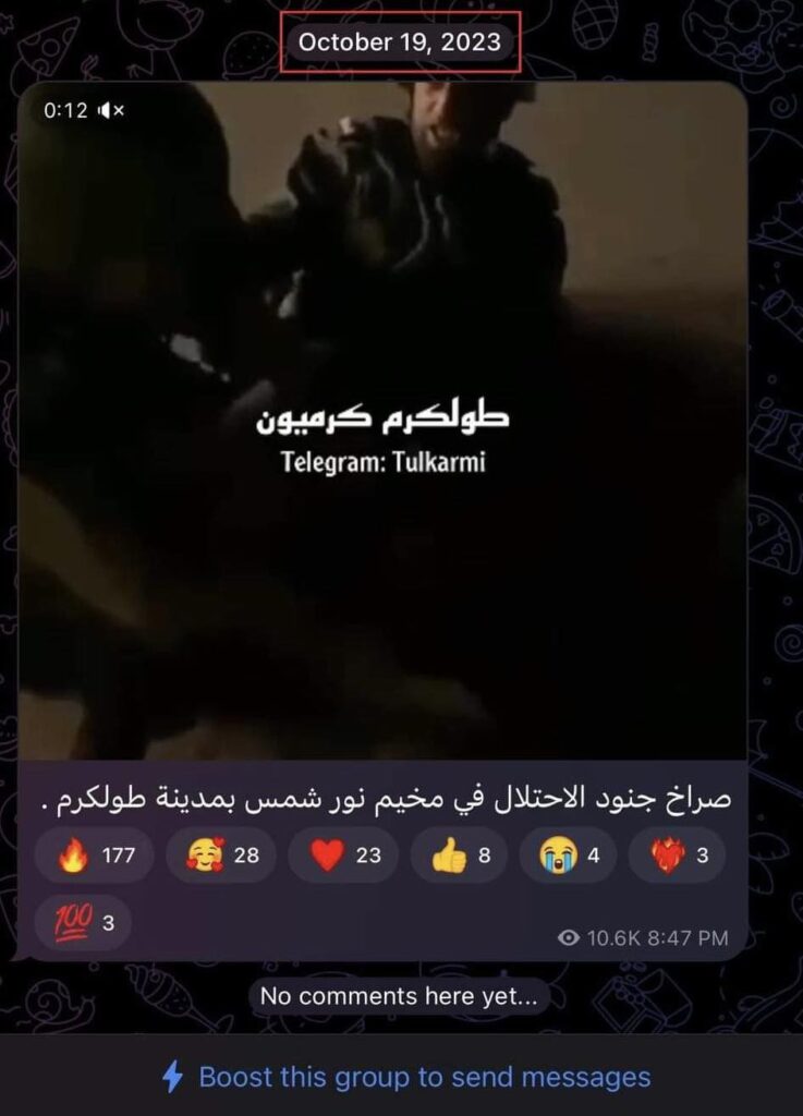 حيث نشرت قناة طولكرم "كرميون" على منصة تلغرام مقطع الفيديو بتاريخ 2023.10.19 مرفقًا بالنص التالي: "صراخ جنود الاحتلال في مخيم نور شمس بمدينة طولكرم ".