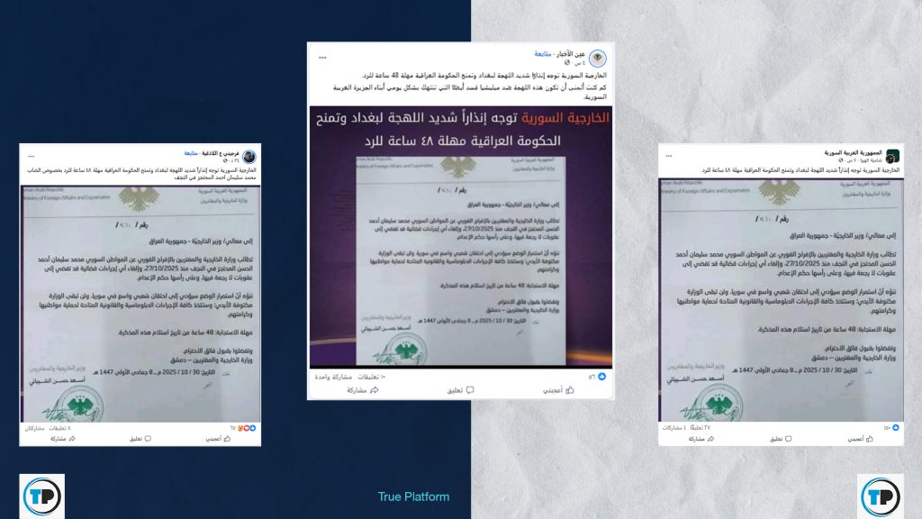 ✅ الادعاء بأن الصورة المتداولة تُظهر وثيقة رسمية تتضمن إنذاراً وجهته وزارة الخارجية السورية للحكومة العراقية، #ملفَّق.