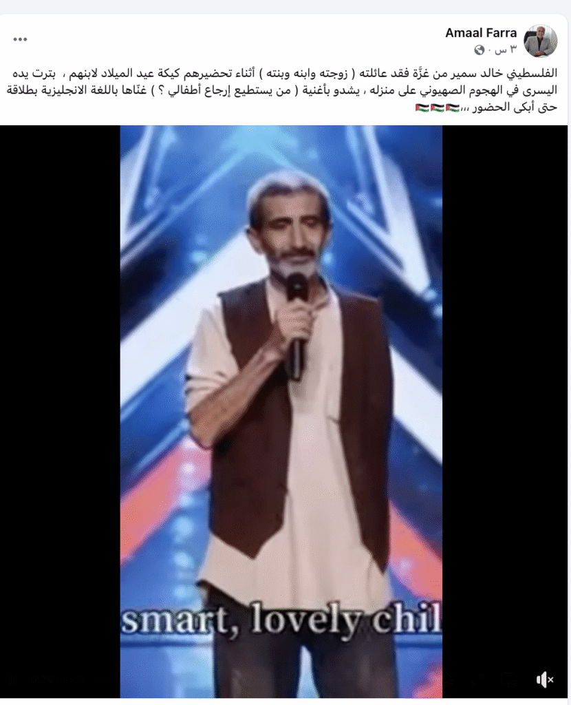 انتشر على مواقع التواصل الاجتماعي مقطع فيديو يظهر فيه شاب يدعى خالد سمير من غزّة مع الادعاء أنه فقد عائلته خلال الحرب وبُترت يده اليسرى، وشارك في برنامج Got Talent حيث غنّى بالإنجليزية وأبكى لجنة التحكيم والحضور. حيث أرفق الفيديو بالوصف التالي: "الفلسطيني خالد سمير من غزَّة فقد عائلته ( زوجته وابنه وبنته ) أثناء تحضيرهم فطيرة عيد الميلاد لابنته الصغرى ، و بترت يده اليسرى في الهجوم الصهيوني على منزله ، يشدو بأغنية ( من يستطيع إرجاع أطفالي ؟ ) غنّاها باللغة الانجليزية بطلاقة حتى أبكى الحضور".