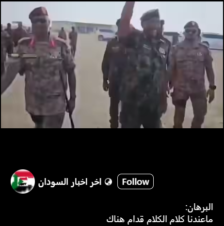 تداولت حسابات على منصة «فيسبوك» مقطع فيديو للقائد العام للقوات المسلحة السودانية عبد الفتاح البرهان، يقول فيه بصيغة حماسية وسط حشد من الضباط والجنود: «ما عندنا كلام الكلام قدام هناك»، على أساس أنه مقطع فيديو حديث للبرهان.