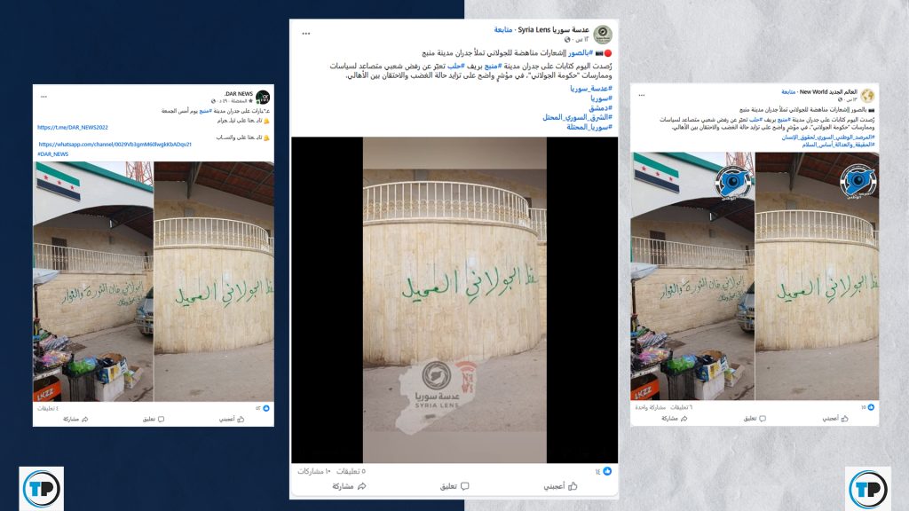 ✅ الادعاء أن الصورتين تُظهران شعارات مناهضة للرئيس السوري #أحمد_الشرع على جدران في مدينة #منبج، غير صحيح.