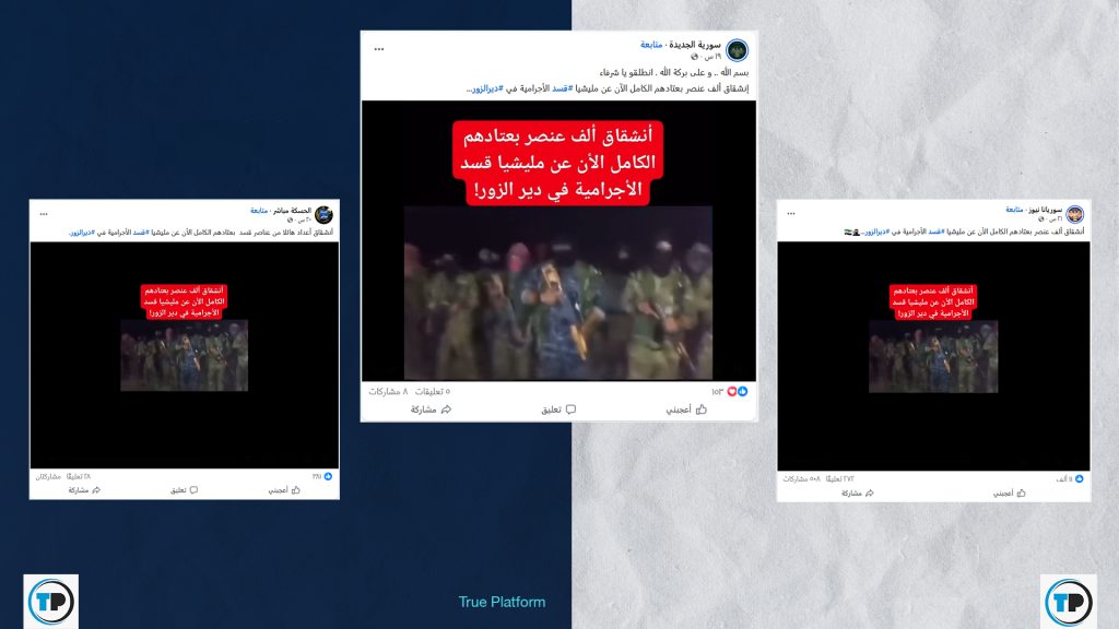 📍تداولت صفحات وحسابات عبر منصة فيسبوك، مؤخراً، مقطع فيديو مع ادعاء أنه يوثّق انشقاق أكثر من ألف عنصر من قوات سوريا الديمقراطية بعتادهم الكامل في دير الزور.