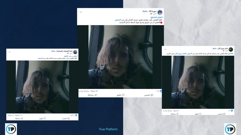✅الادعاء بأن السلطات السورية ألقت القبض على منفذي تفجير مسجد الإمام علي في حمص #غير_صحيح. ✅الصورة المستخدمة نشرتها وسائل إعلام محلي على أنها توثق اعتقال تاجر #مخدرات في #دير_الزور. ✅يستند الادعاء على استخدام صورة لواقعة حقيقية ونسبها لواقعة أخرى. لذا صنف ضمن محتوى "#مُضلل" وفق منهجية شبكة تدقيق المعلومات - True Platform.