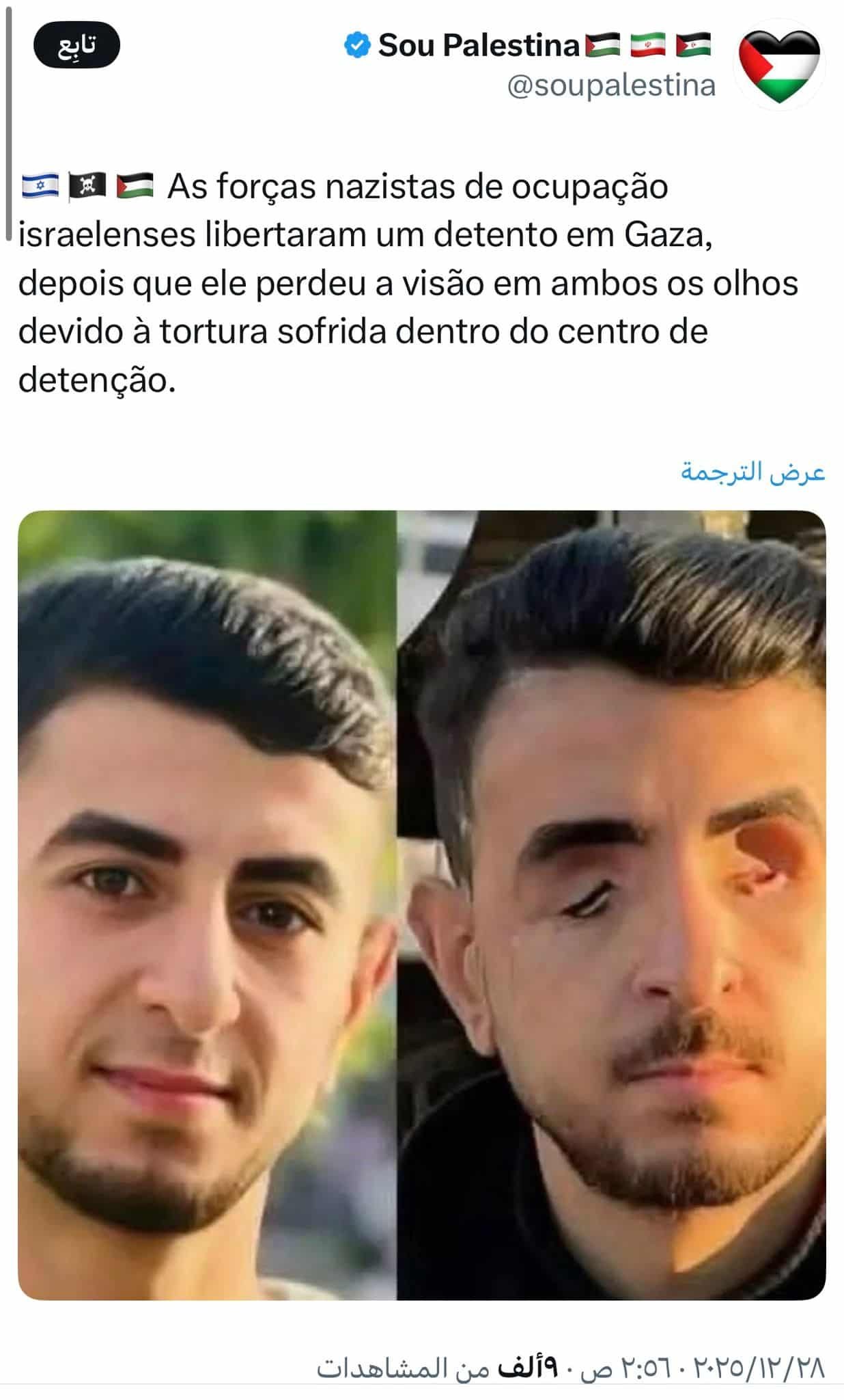 | كشف تدقيق مرصد "تحقّق" أن الصورة تعود للشاب محمد مشتهى، الذي نفى للمرصد صحة الادعاءات المتداولة، مشيراً إلى أنه أصيب أُصيب برصاص طائرات الاحتلال المسيّرة أثناء خروجه لتوفير الطعام لعائلته وأشقائه، ولم يكن معتقلاً لدى الاحتلال. كما أظهر التدقيق أن الأسير محمود أبو الفول من مخيم جباليا، فقد بصره نتيجة التعذيب والإهمال الطبي داخل سجون الاحتلال، وفقاً لما أكدته للمرصد مديرة المركز الفلسطيني للدفاع عن الأسرى في قطاع غزة، لينا الطويل. |