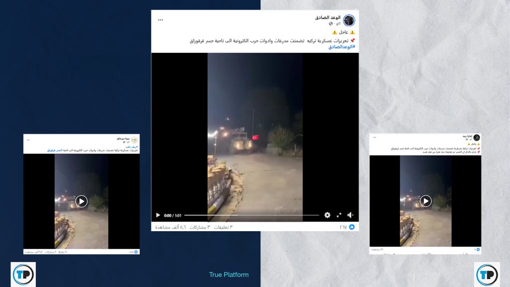 📍تداولت حسابات وصفحات في مواقع التواصل الاجتماعي، مؤخراً، مقطع فيديو مع ادعاء أنه لتعزيزات عسكرية تركية ضخمة، تضم مدرعات ومنظومات حرب إلكترونية وصلت إلى ناحية "جسر قرقوزاق"، حيث مناطق التماس بين الجيش السوري وقوات سوريا الديمقراطية (قسد).