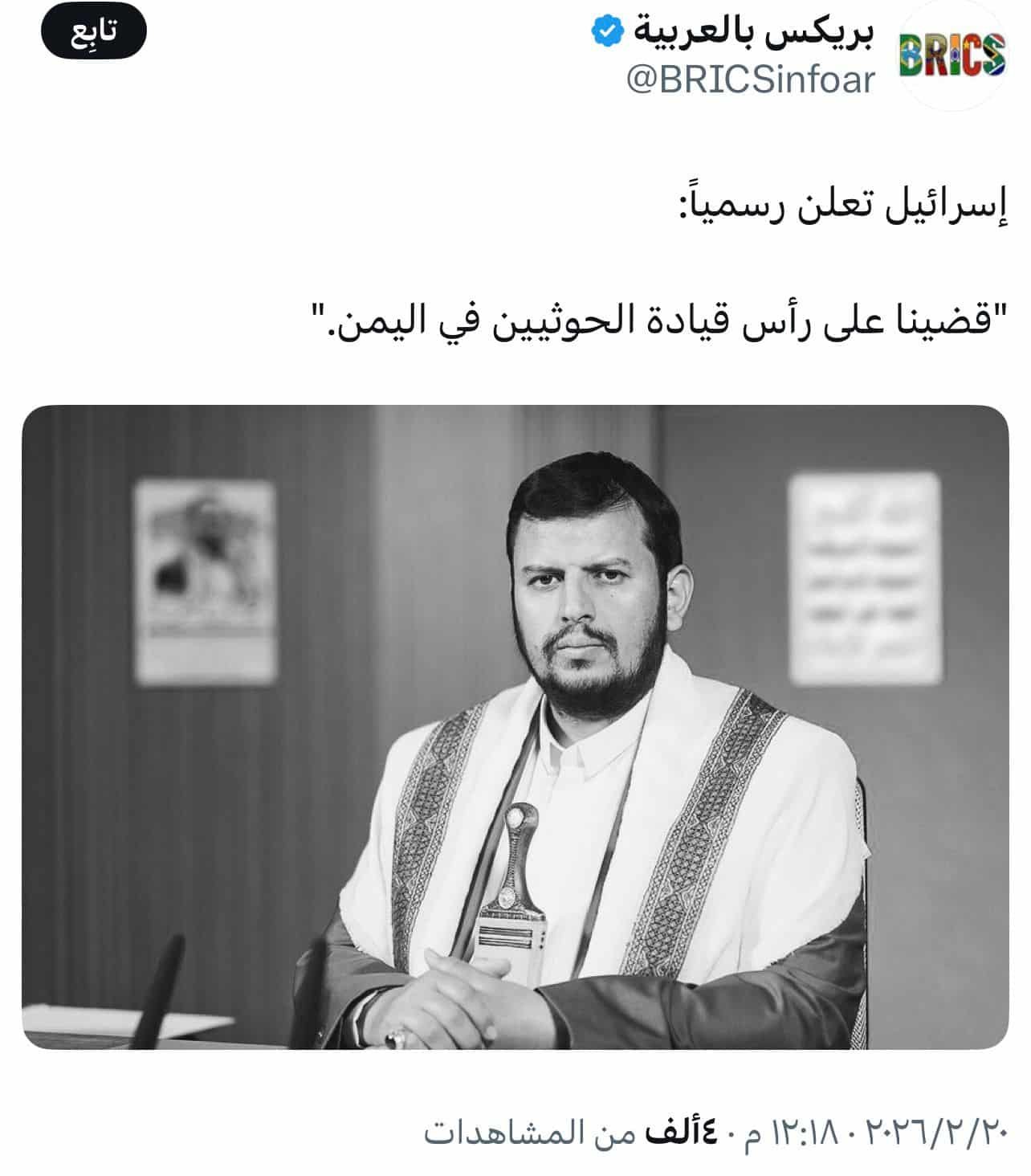 | كشف تدقيق مرصد "تحقق" أن الخبر المتداول الذي نسب إلى وزير الدفاع الإسرائيلي حول القضاء على قيادات الحوثيين في اليمن غير صحيح، إذ لم تصدر أي تصريحات رسمية تؤكد ذلك، فيما ركزت التصريحات الإسرائيلية الأخيرة تركز على تحذيرات من أي هجوم محتمل واستعداد الجيش للرد الفوري والحاسم. يُذكر أن آخر ظهور لعبد الملك الحوثي كان يوم الخميس 19 فبراير/شباط، حيث ظهر في محاضرة رمضانية نُشرت عبر القناة الرسمية للإعلام الحربي اليمني. |