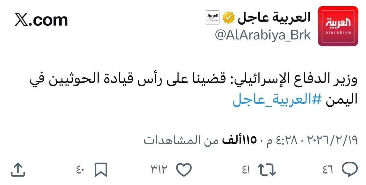 | وزير الدفاع الإسرائيلي: قضينا على رأس قيادة الحوثيين في اليمن. |