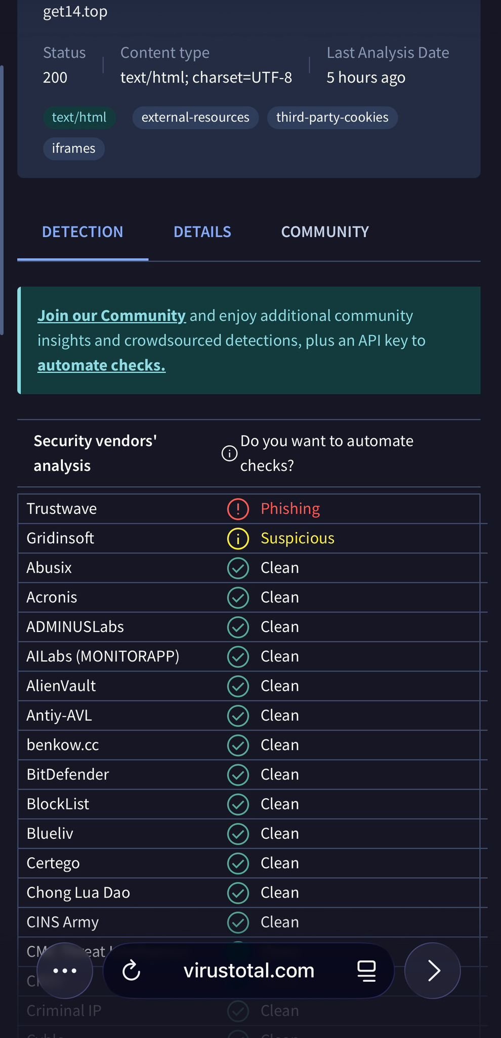 وبحسب التحليل الفني، صُنّف الرابط كنشاط احتيالي ومشبوه؛ إذ يعمد إلى استخدام موارد خارجية وملفات تعريف ارتباط قد تستغل في عمليات التصيّد الإلكتروني وسرقة البيانات الشخصية، ما يجعله خطرًا يهدد خصوصية المستخدمين.