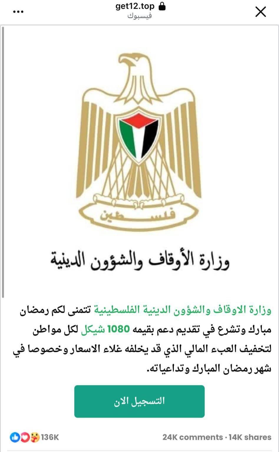 | كشف تدقيق مرصد "تحقّق" أن الإعلان مفبرك ولم يصدر عن أي جهة رسمية، وقد نفته الوزارة في كل من الضفة الغربية وقطاع غزة، محذرةً المواطنين من الوقوع ضحيةً لعمليات النصب الرقمي |