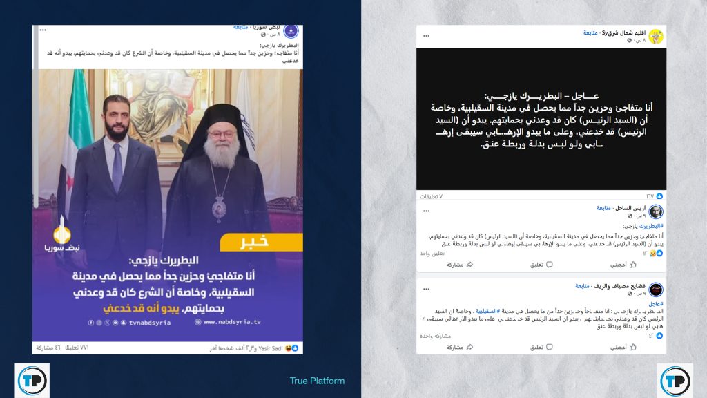 ✅الادعاء بأن البطريرك يازجي صرح بأن الرئيس السوري #أحمد_الشرع "خدعه" أو نكث بوعده بحماية مدينة #السقيلبية، هو ادعاء غير صحيح.