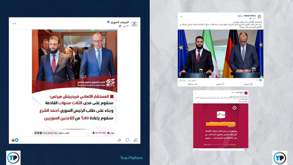 📍تداولت مواقع إعلامية و صفحات وحسابات عبر منصات التواصل، مؤخراً، منشورات تزعم أن #المستشار_الألماني فريدريتش ميرتس قال خلال المؤتمر الصحفي مع الرئيس السوري أحمد الشرع اليوم في برلين: "سنقوم على مدى الثلاث سنوات القادمة وبناء على طلب الرئيس السوري أحمد الشرع سنقوم بإعادة 80% من اللاجئين السوريين".