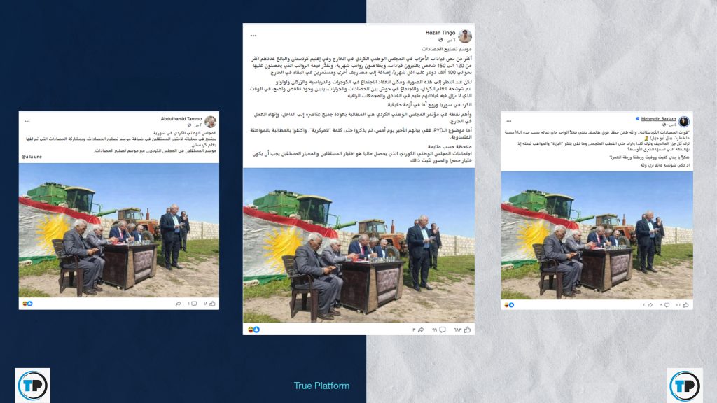 ✅ الصورة التي تظهر اجتماعاً للمجلس الكردي وبخلفيتها آليات زراعية خضعت لعملية #تعديل_رقمي حيث تم دمج عناصر غير حقيقية في خلفية الصورة الأصلية.