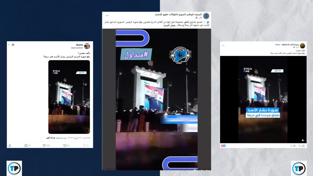 📍تحرى فريق شبكة تدقيق المعلومات-True Platform، حقيقة #الفيديو، وتبين في الخلاصة: ✅الفيديو ليس حديثاً ولا يصور "رفعاً" للصورة كما رُوّج له. ✅المقطع يعود في الأصل إلى فعالية نظمها نشطاء في درعا بتاريخ 18 آذار/مارس (ذكرى انطلاق #الثورة_السورية)، وكان الهدف منها هو إحراق الصورة وليس رفعها.✅تبين أن الادعاء يستند إلى إعادة نشر فيديو قديم مع مزاعم ملفقة؛ لذا صُنّف ضمن محتوى "#مضلل" وفق منهجية شبكة تدقيق المعلومات -True Platform.
