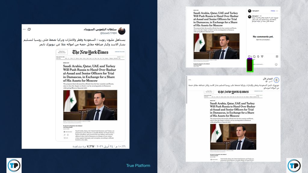 📍تداولت صفحات ومنصات إخبارية نصاً باللغة الإنجليزية منسوباً لصحيفة "#نيويورك_تايمز" الأمريكية، يزعم وجود صفقة مقترحة بين (السعودية، قطر، الإمارات، وتركيا) وروسيا، تضغط بموجبها هذه الدول لتسليم #بشار_الأسد وكبار ضباطه للمحاكمة في #دمشق بتهم جرائم حرب، مقابل منح موسكو حصة من أصوله المالية.