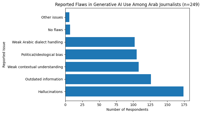 Respondents identified several recurring flaws when using generative AI. Hallucinations were the most frequently reported issue, cited by 174 journalists. Outdated or insufficiently updated information was reported by 126 respondents, while weak understanding of Arab political and economic contexts was noted by 108 respondents. Perceived political or ideological bias was reported by 105 journalists, and weak handling of Arabic dialects by 102. Only a small number of respondents reported encountering no flaws (7) or other unspecified issues (6).