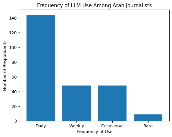Large language models are no longer experimental tools in Arab journalism. Most surveyed journalists use LLMs frequently, often on a daily basis, indicating that generative AI has become part of routine newsroom workflows rather than an optional or peripheral technology.