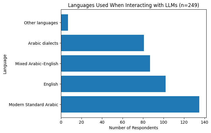 Journalists reported using multiple languages when interacting with LLMs. Modern Standard Arabic was the most commonly used language (135), followed by English (102). A substantial number of respondents reported mixing Arabic and English (87), while 81 indicated using Arabic dialects. A small number reported using other languages (7).