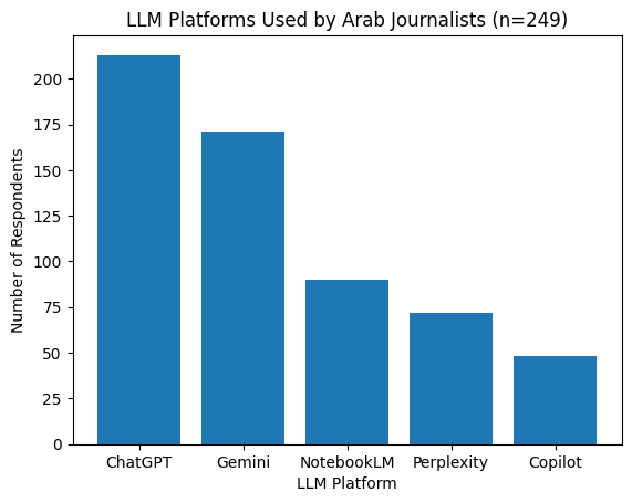 The findings indicate widespread adoption of LLMs among Arab journalists. ChatGPT is the most commonly used platform, reported by 213 respondents, followed by Gemini (171), Google NotebookLM (90), Perplexity (72), and Copilot (48). Many respondents reported using more than one model, suggesting that journalists often combine tools rather than relying on a single platform.