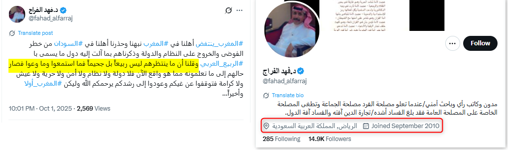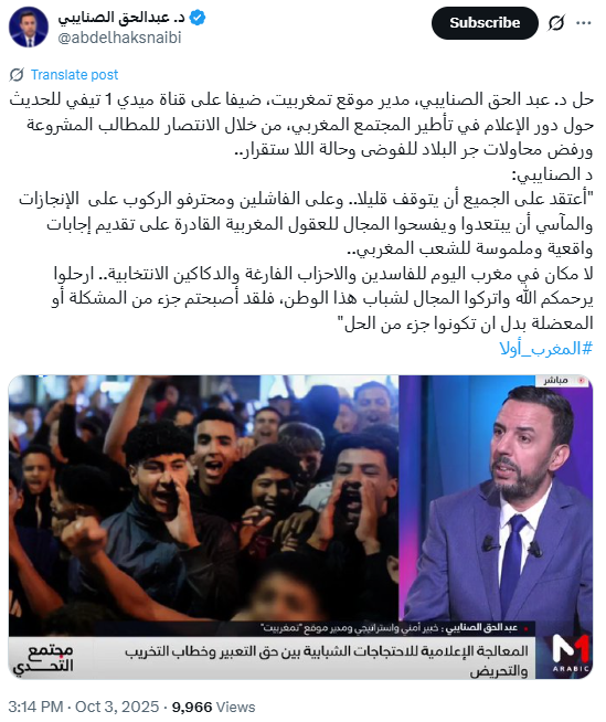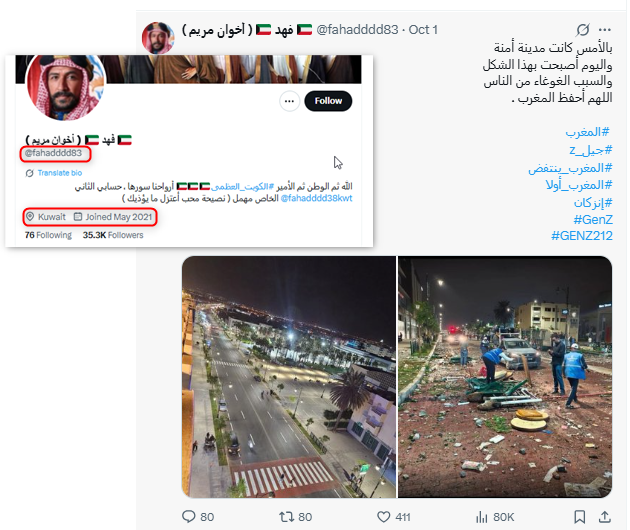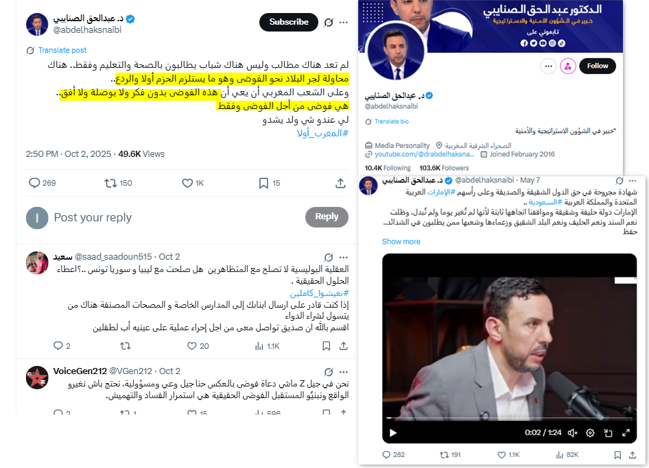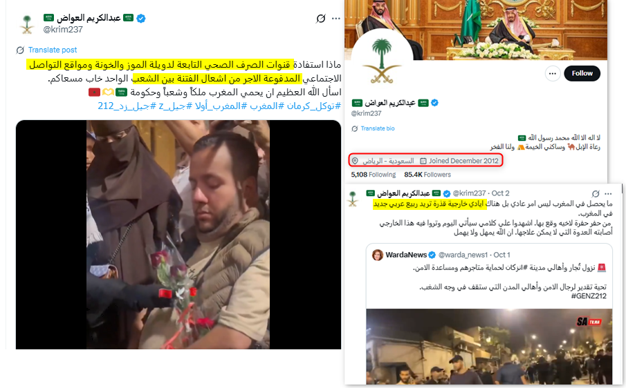 وهي الاتهامات ذاتها التي كررها حساب "عبدالكريم العواض" (@krim237)، وهو حساب سعودي أعاد نشر الادعاءات حول ضلوع "أيادٍ خارجية" وصفها بأنها "قذرة" في الاحتجاجات المغربية.