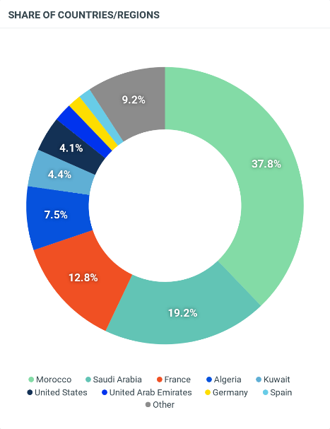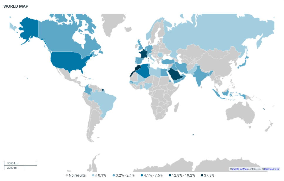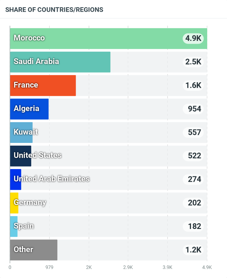 أظهرت التحليلات أن النسبة الأكبر من المنشورات قد صدرت من المغرب، ورغم أن الأحداث وقعت بها إلا أن نسبة المنشورات الصادرة منها بلغت فقط نحو 38% فقط من إجمالي عدد المنشورات، وتلتها السعودية بنسبة 19.2% ثم فرنسا بنسبة 12.8%، تلتها الجزائر بنسبة 7.5%.