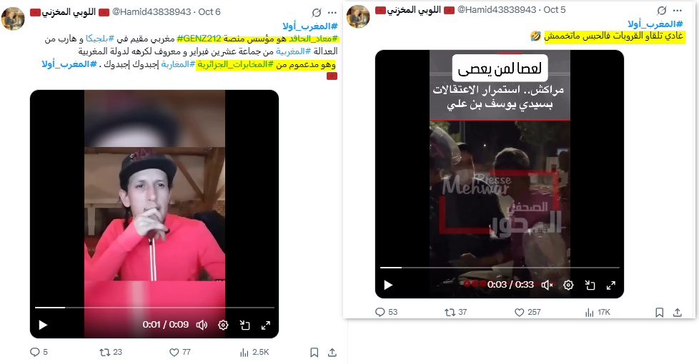 يتهم حساب "اللوبي المخزني" الجزائر بدعم المحتجين بالمغرب، كما نشر أن مؤسس منصة #GENZ212 هو مغني الراب "معاد الحاقد"، وهو ما نفته الحركة في بيان رسمي لها، لكن الخبر لم يكن إلا مجرد جزء من خطاب التحريض الذي يتبناه الحساب ضد أي معارضين للنظام الحاكم بالمغرب.