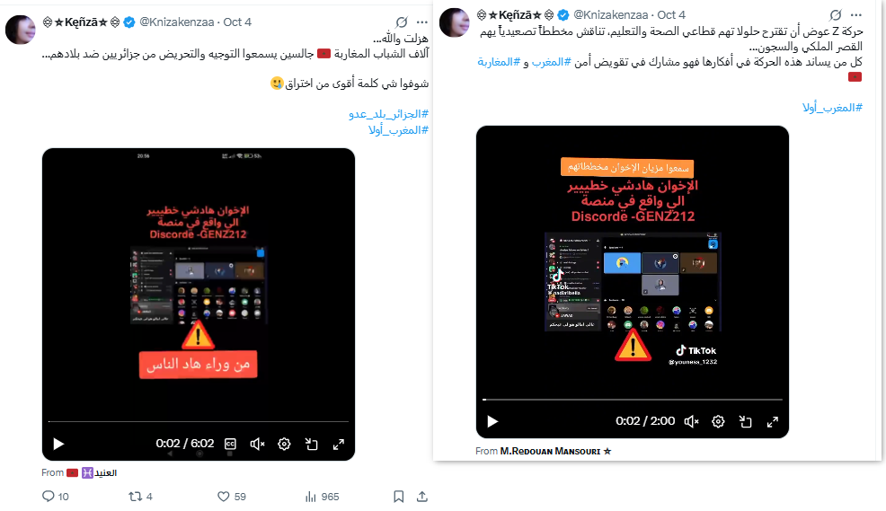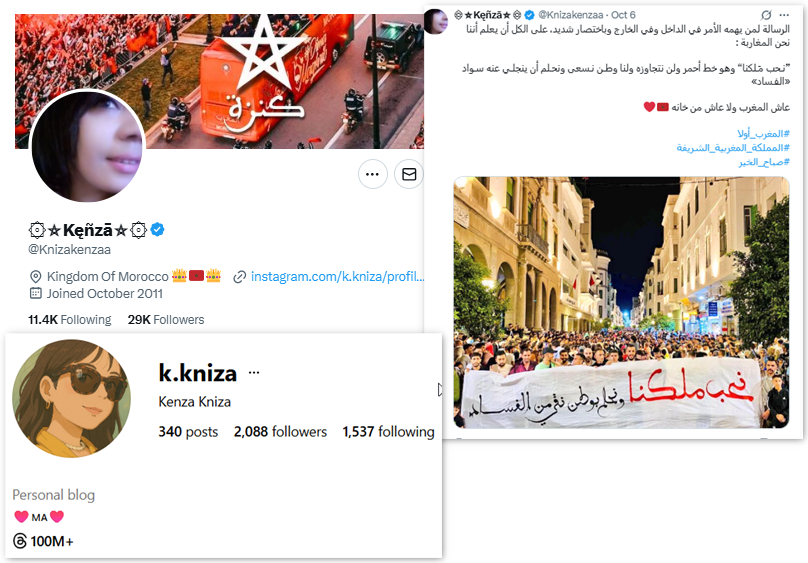 يركز حساب "@Knizakenzaa" على اتهام الجزائر بالتآمر على النظام المغربي، فقد أعاد الحساب نشر محتوى يتهم المحتجين بالالتجاء إلى "مرتزقة" يدربوهم على "الإسقاط السلمي للأنظمة".