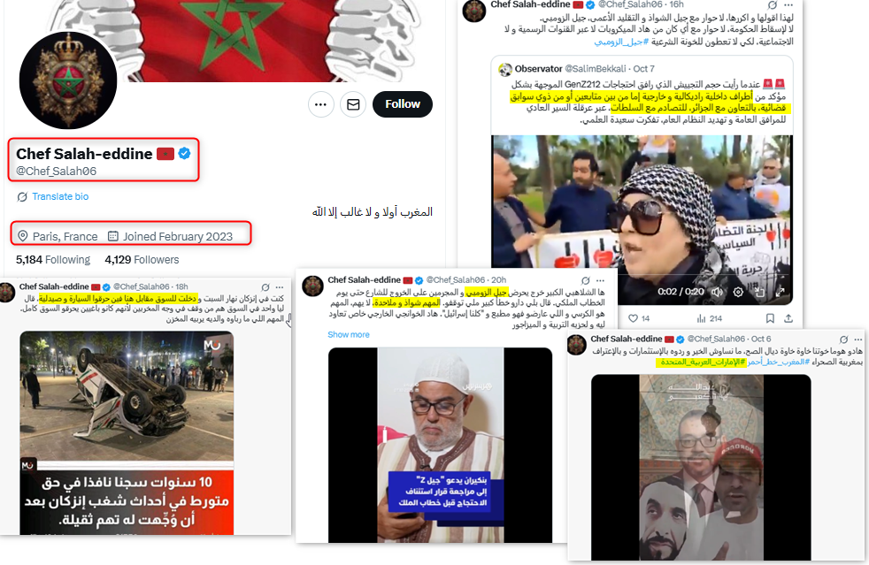 أما حساب "Chef Salah-eddine"، فلم يخرج عن السردية ذاتها التي روّجت لها الحسابات السابقة، غير أنه حدّد موقعه في باريس – فرنسا. وقد كرّر الحساب نفس الاتهامات التي تداولتها تلك الحسابات، بشأن ما وصفه بـ"تآمر الجزائر والإخوان المسلمين على المغرب"، كما نشر تغريدة شكر موجّهة إلى دولة الإمارات.