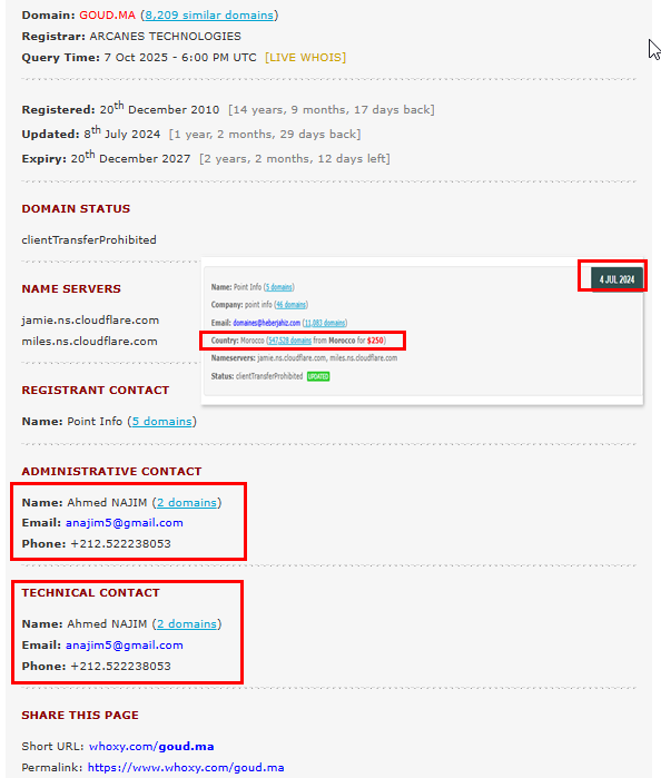 ومن خلال التحقق من نطاق الموقع الإلكتروني، تبيّن أنه مسجَّل بتاريخ 4 تموز/يوليو 2024 في المغرب باسم "Ahmed Najim"، مع ظهور بريده الإلكتروني ورقم هاتفه ضمن بيانات التسجيل. غير أن التحقق من رقم الهاتف أظهر أنه مسجَّل باسم "جريدة كود".