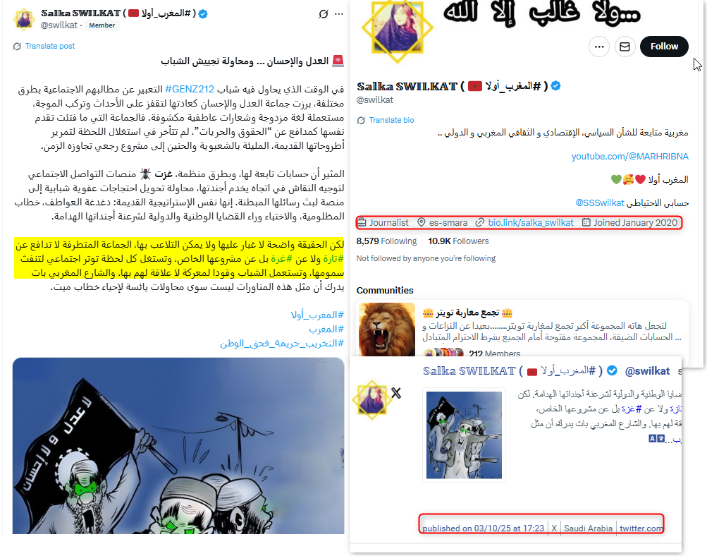 أما حساب "Salka ASWILKAT" فقد وجّه اتهامات إلى جماعة العدل والإحسان بـ"القفز على الأحداث وركوب موجتها" من أجل نشر أجندتها المليئة بالشعبوية والحنين إلى مشروع رجعي.