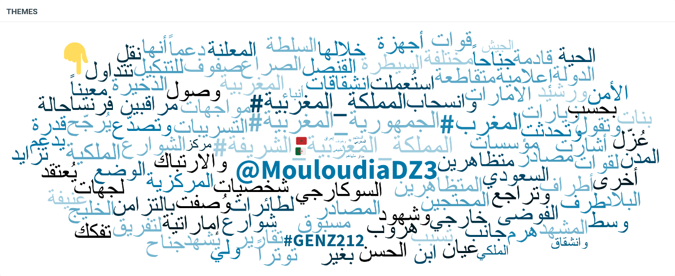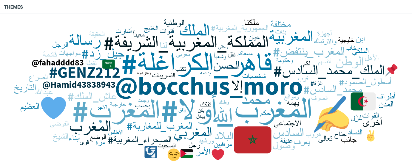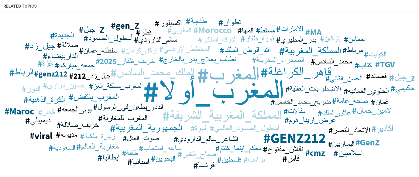 كما تُظهر سحابة الكلمات أيضاً حضور مجموعة من الوسوم الداعمة للنظام الحاكم في المغرب، مثل: #المغرب_أولا، #الملك_محمد_السادس، و#المملكة_المغربية_الشريفة.