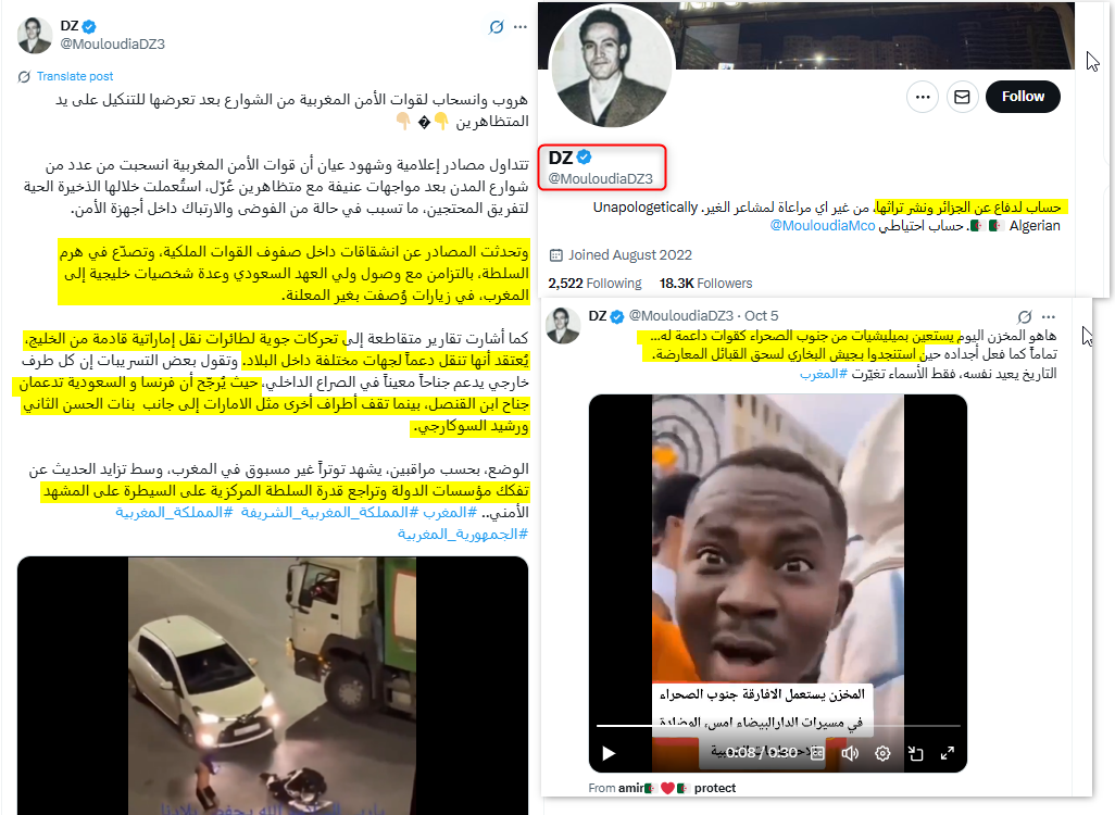 من أبرز هذه الحسابات، حساب "DZ @MouloudiaDZ3"، وهو حساب جزائري حديث، ركز في منشوراته على نشر أخبار عن هزيمة وانهيار قوات الأمن المغربية وتفكك مؤسسات الدولة، وحدوث انشقاقات في صفوف القوات الملكية، وهو ما لم يتأكد ولم نجد عليه أي دليل.