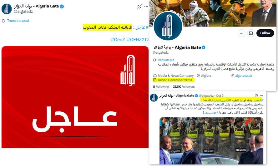 في الأول من تشرين الأول/أكتوبر 2025، نشر حساب جزائري يحمل اسم "بوابة الجزائر" خبراً مضللاً زعم فيه أن العائلة الملكية غادرت المغرب، دون أن يورد أي مصدر رسمي يؤكد ذلك. كما نشر الحساب نفسه خبراً آخر ادعى فيه أن المغرب فقد حق استضافة كأس الأمم الإفريقية المقبلة، وهو ادعاء لم نجد له بدوره أي تأكيد من مصادر رسمية أو موثوقة.